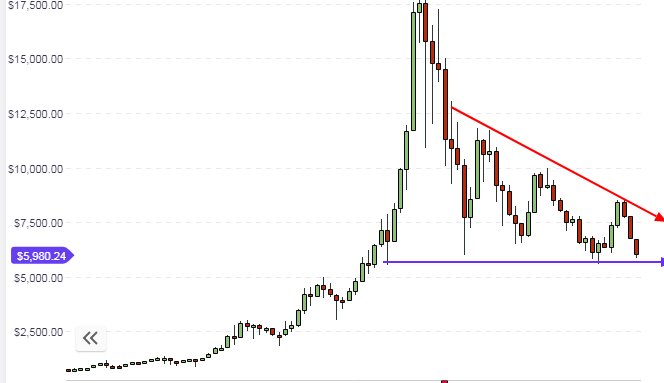 BTC/USD has approached the $5,900 level, which is very close to the support area of $5,700 that was seen in June 2018. At that time, we saw a massive entry by the bulls, who saw that price level as a cheap area at which to assume long positions on the number 1 cryptocurrency. The picture on the weekly chart as far as the key levels of support and resistance remains unchanged, with the price once more pushing towards the horizontal support price of $5,700.