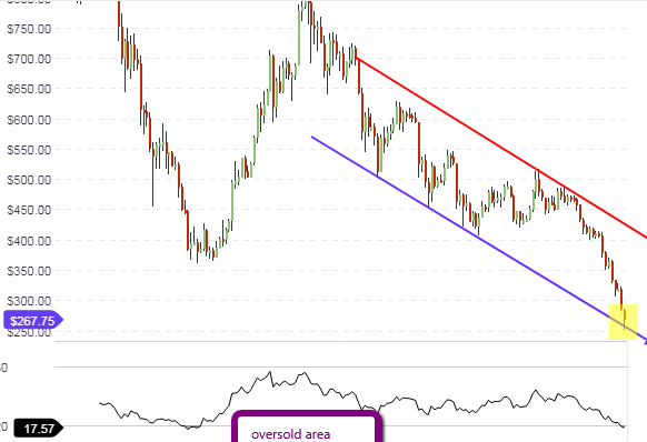 The daily chart which provides the medium-term outlook for the ETH/USD pair shows a number of important things. First, price seems to be confined now within the boundaries of a downward channel, and price seems to have stalled at the lower channel trendline. This is in keeping with the picture on the weekly chart, where price action is now at the $268 support level. We also see the Relative Strength Index line heading into the oversold area. This is by no means a signal to buy, as we would need the RSI to display the failure swing behavior for any upward reversal to occur.