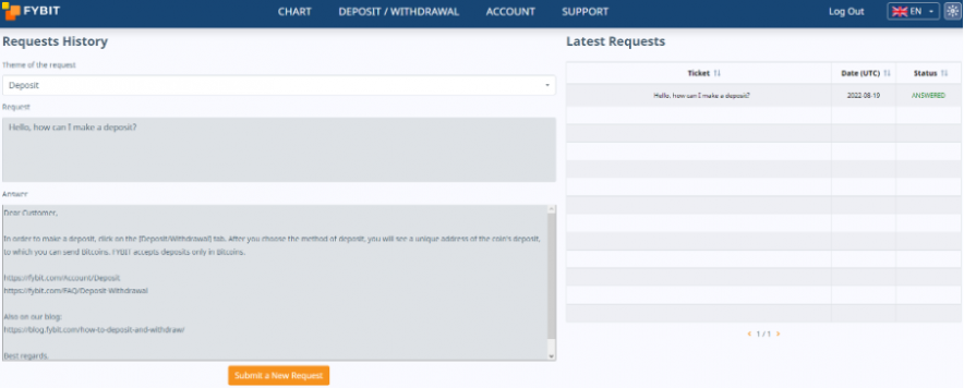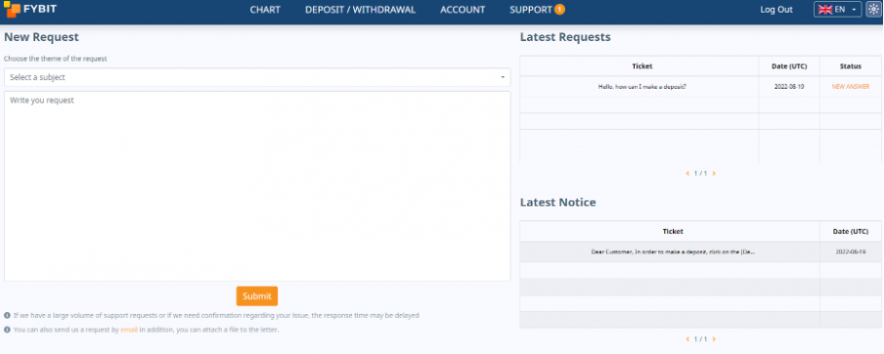 Send your question through a convenient form in your personal account – and FYBIT customer support specialists will answer you within a few minutes (according to statistics, the average response time to a request is less than 10 minutes).