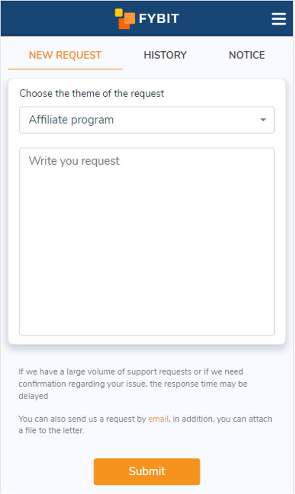 If you have already used the FYBIT platform, you probably noticed that the main principle of the interface is simplicity and convenience. Submitting a support request is no exception.