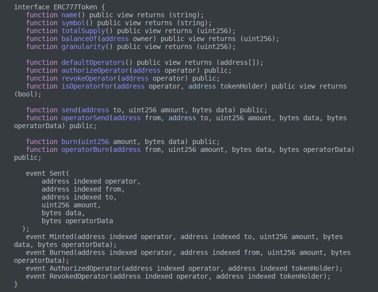 ). Another aspect of ERC-777 is allowing for ‘approved operators’ – parties that can approve smart contracts to move tokens on their behalf.