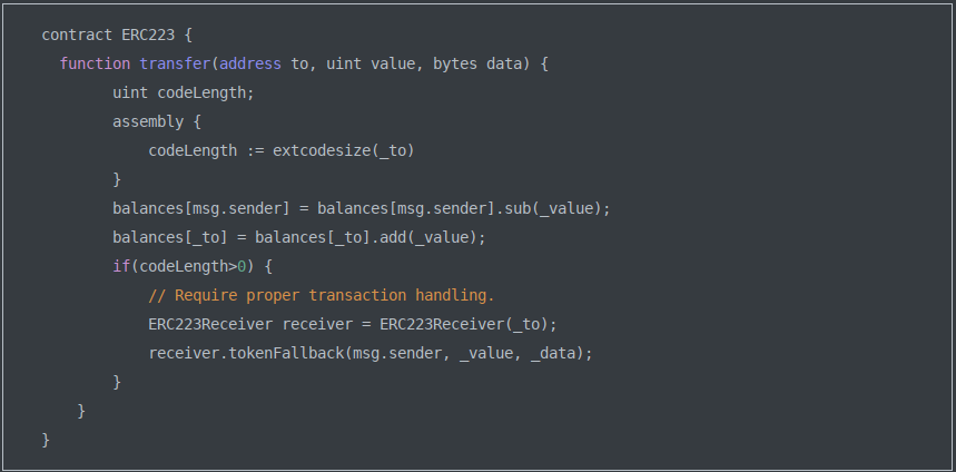 ) and therefore needing to trust the UI/UX developers, ERC-223 follows the Ethereum Classic reasoning of “code if law”, implementing security on the lower levels.