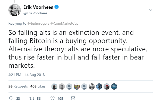 Rogers’ comments come at a time when altcoin prices are facing huge declines while Bitcoin is stubbornly holding a firm support level around $6,000. Additionally, Bitcoin is regaining its dominance over the cryptocurrency market, leading “Bitcoin Maximalists” like Rogers to see the current state of the market as Bitcoin’s triumphant return as the “true” cryptocurrency. Rogers’ comments have been met with mixed responses, with ShapeShift CEO, Erik Voorhees offering an alternative point of view via his response to Rogers’ tweet,