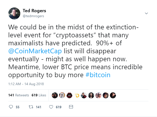 As the crypto market bleeds off more gains this week, Xapo president Ted Rogers is calling the increasing bearish momentum a possible “extinction-level event” for the majority of altcoins. Rogers does not see this as the end of the market, however, but rather considers the dip in the market an